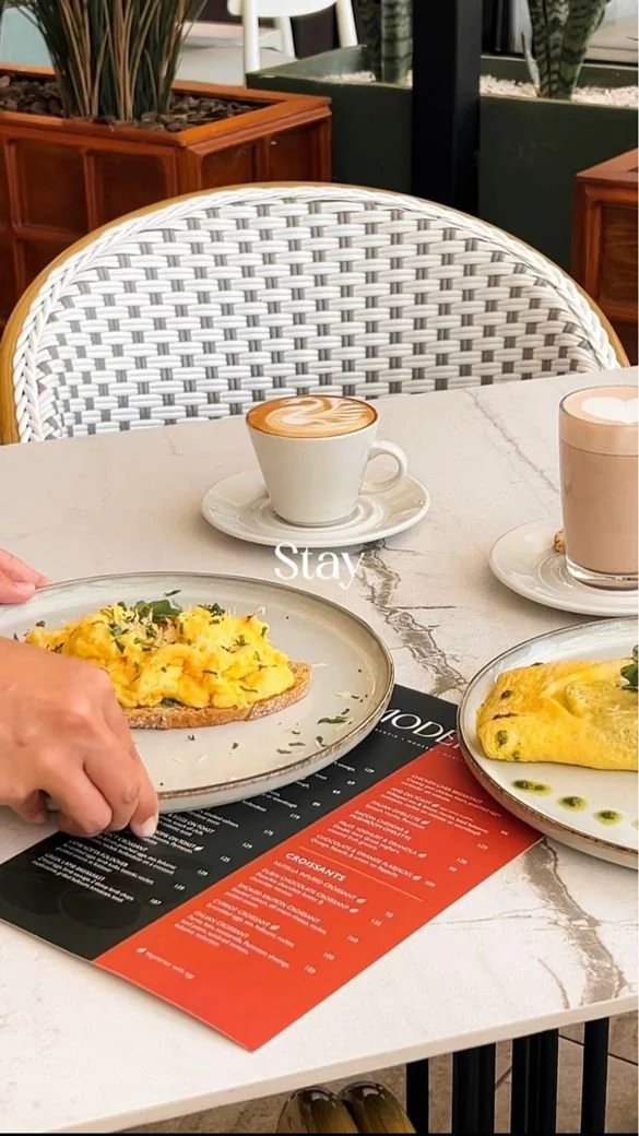 Streaky bacon, poached eggs, avo, balsamic tomatoes, rocket, hollandaise on a croissant